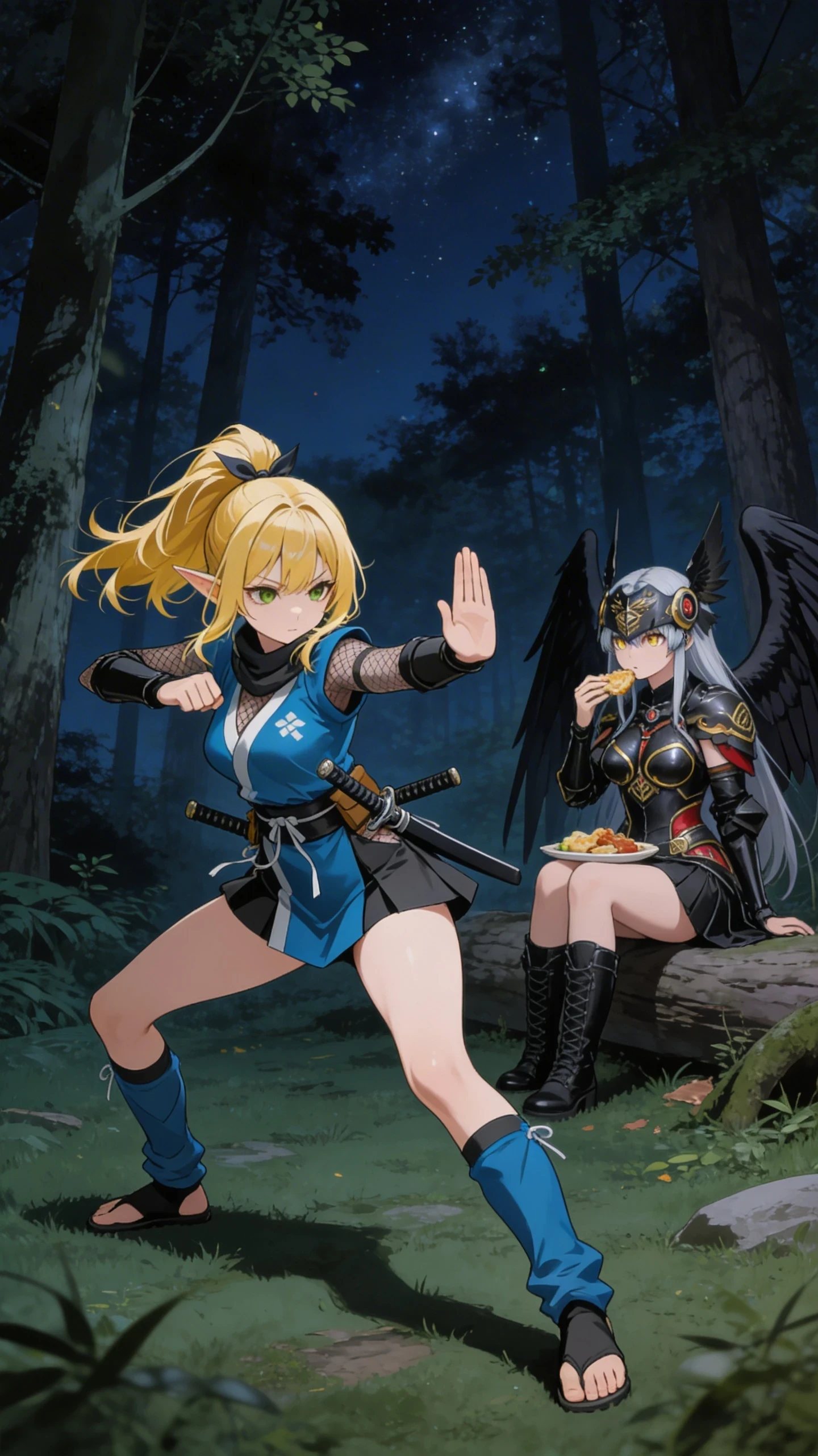 レティチュ=ド=エーロは、その深い闇の中に佇んでいた。金髪のポニーテールは闇夜の中でかすかな光を帯び、エルフ特有の長い耳がわずかに震える。青い忍者装束は暗闇に溶け込み、白いサッシュだけがぼんやりと浮かび上がっていた。彼女の緑色の瞳は、闇を見透かすように細められていた。
